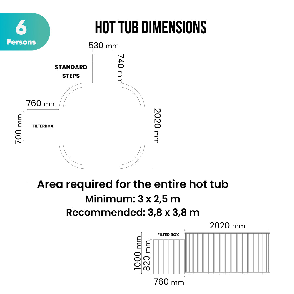 Square Wood Fired Hot Tub with Jets | External stove, sand filter & UV-C | 16 jets | 4–8 seater